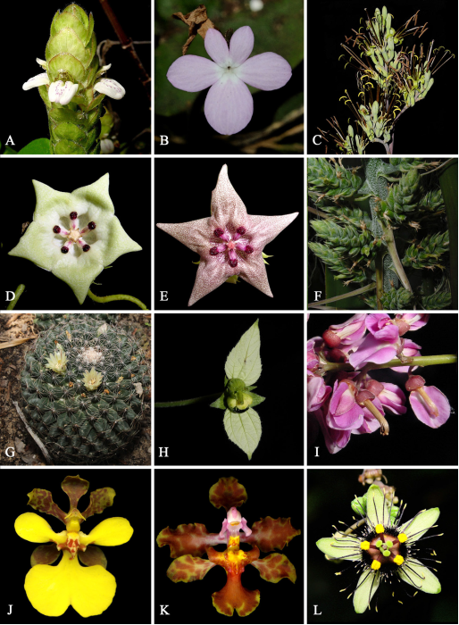 Fig. 1. Ejemplo de algunos taxones endémicos de la Península de Yucatán. A. Justicia lundelli Leonard. B. Stenandrium subcordatum Standl. (Acanthaceae). C. Manfreda paniculata L. Hern., R.A. Orellana y Carnevali (Asparagaceae). D. Dyctianthus aeneus Woodson. E. Dyctianthus yucatanensis Standl. (Apocynaceae). F. Hohenbergia mesoamericana I. Ramírez, Carnevali y Cetzal (Bromeliaceae). G. Mammillaria gaumeri (Britton y Rose) Orcutt (Cactaceae). H. Dalechampia schottii Greenm. var. schottii (Euphorbiaceae). I. Lonchocarpus castilloi Standl. (Fabaceae). J. Cohniella yucatanensis Cetzal y Carnevali. K. Lophiaristapiae Balam y Carnevali (Orchidaceae). L. Passiflora itzensis (J.M. MacDougal) Porter-Utley (Passifloraceae).