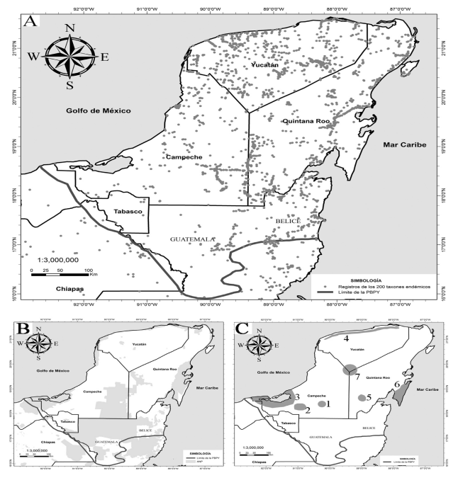 Fig. 2. Colecciones, áreas naturales protegidas y lugares de especial atención en la PBPY, México. A. Distribución de los registros de herbario de la flora endémica (línea azul, límite de la PBPY). B. Áreas naturales protegidas. C. Lugares de especial atención en la PBPY por su baja densidad de colección botánica y/o especial interés biológico. 1) Candelaria (SO de Campeche; 2) Tuxpeña (SO de Campeche; 3) Laguna de Términos (SO de Campeche); 4) Calichal al norte de la ciudad de Mérida y extendiéndose en una estrecha franja hasta el NE de Yucatán (N Yucatán); 5) Sabana del Jaguactal (SO Quintana Roo); 6) Punta Herrero, Mahahual-Xlacak (SO de Quintana Roo); 7) Punto Put (límites entre los estados de la PY).