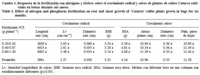Las plantas de cafeto necesitaron dosis bajas de fertilización con N y P para alcanzar buen término previo a su establecimiento en campo, mientras que en las dosis mayores sólo hubo absorción adicional de los nutrientes sin que ello se reflejara en aumento del crecimiento. Las bolsas de 18x23 cm presentan ventajas sobre las bolsas más pequeñas, de frecuente uso en los viveros comerciales, pues permiten producir plantas vigorosas, potencialmente aptas para lograr cafetos adultos de elevado rendimiento.