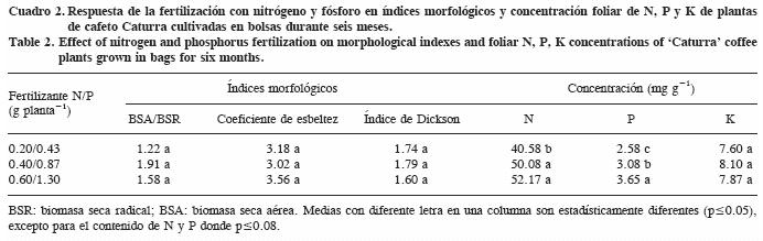 Los niveles foliares de N fueron similares a los observados por Arizaleta et al. (2002) en cafetos de la variedad Catuaí Amarillo de la misma edad, pero los niveles de P fueron hasta tres veces superiores. Para plantas adultas en producción de C. arabica, Mills y Jones (1996) indican que, en promedio, los niveles adecuados de N y P son 30.0 y 2.5 mg g1, y según Ochoa et al. (2001), la dosis de P para un máximo rendimiento debería ser al menos 2.0 mg g1. En el presente estudio estos niveles fueron hasta 70 a 80% superiores, lo cual pudiera atribuirse a la condición de plantas muy jóvenes o al posible consumo de lujo ya mencionado. Van Wijk et al. (2003) señalan que el P absorbido en exceso es convertido en polifosfato u otros fosfatos sin afectar el crecimiento de las plantas.