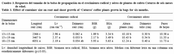 El tamaño de la bolsa de propagación afectó (p<0.05) todas las variables de crecimiento, con excepción de Lv y el número de pares de hojas (Cuadro 3). En las bolsas de menor tamaño las raíces fueron de menor longitud y mayor diámetro; en las bolsas de mayor tamaño hubo mayor acumulación de biomasa en la raíz.