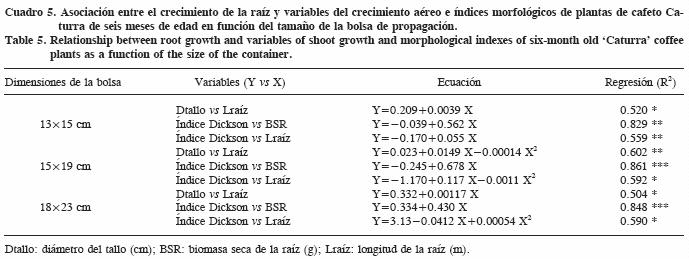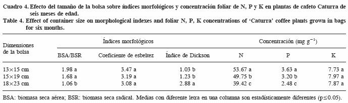 Los índices morfológicos fueron afectados por las dimensiones de la bolsa (Cuadro 4). La relación parte aérea/raíz fue menor en las bolsas más grandes; es decir, en términos relativos el incremento de la biomasa de la raíz fue mayor que el incremento de la parte aérea, o bien, al usar bolsas pequeñas se afecta más el crecimiento radical que el de la parte aérea. El índice de Dickson, que es una medida integral del vigor de la planta, fue mayor en las bolsas más grandes; y como este índice se emplea para predecir el comportamiento en campo de especies de coníferas (Birchler et al., 1998), se infiere que las plántulas de cafeto desarrolladas en las bolsas de mayor tamaño alcanzarían más fácilmente el establecimiento en campo y posterior etapa productiva. Por el contrario, el índice de esbeltez no fue afectado por el tamaño de la bolsa.
