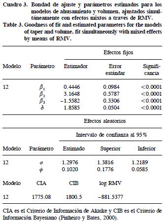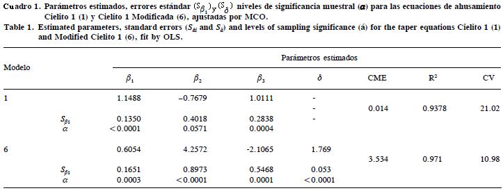 Para generar el sistema compatible de ahusamientovolumen se tomó como base el modelo de ahusamiento Cielito 1 (Rentería, 1995), con el que se han obtenido buenos ajustes en P. cooperi Blanco en Durango, y en otras especies del Estado de Chihuahua (Corral et al., 1999). Para Durango este modelo se ajustó a partir de la altura del tocón y del diámetro normal, dando mejores resultados en el segundo caso; sin embargo, dos de sus parámetros no fueron estadísticamente significativos. En Chihuahua se ajustó el modelo sólo a partir del diámetro normal. El modelo Cielito 1 es lineal: