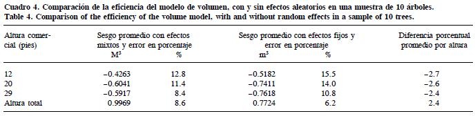 Para validar la pertinencia de la estructura propuesta se usaron datos de diez árboles del Ejido La Victoria, los cuales fueron cubicados con la misma metodología que los usados para el ajuste. En estos árboles se midieron cuatro diámetros a alturas fáciles de medir en campo (altura del tocón, 0.6, 1.3 y 2.0 m ); los diámetros normales de estos árboles oscilaban entre 24 y 40 cm con alturas totales entre 12 y 28 m. Se decidió comparar las predicciones a cuatro alturas comerciales medidas en pies 12 (3.67 m), 20 (6.11 m), 30 (9.17 m) y altura total con y sin el uso de la estructura de efectos aleatorios. Se usó como una medida de comparación de la eficiencia de ambos ajustes el sesgo, definido cómo