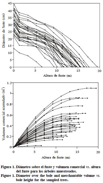 Se obtuvieron datos de 29 análisis troncales de P. cooperi Blanco siguiendo la técnica reportada por Manzanilla (1981); para ello se seleccionaron árboles sin daño físico o mecánico de todas las categorías de diámetro y alturas presentes. Para los cálculos de cubicación se usó el método de trozas traslapadas que permite obtener volúmenes totales y parciales más precisos (Bailey, 1995). Los datos de ahusamiento y volumen acumulado se presentan en la Figura 1. Además se tuvo datos de 10 árboles de la misma especie recolectados del predio Ejido La Victoria cercano al área en estudio; eran árboles derribados, de los cuales se obtuvo el diámetro a la altura del tocón y a 2 m. Los datos se usaron para validar y probar las metodologías propuestas.