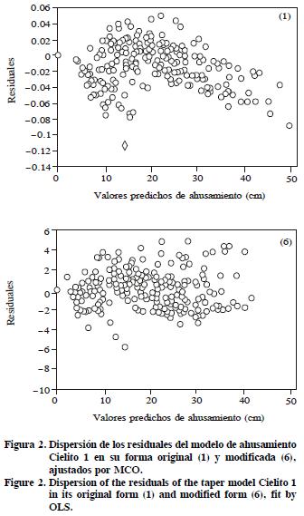 Si se observan los residuales de ambos modelos (Figura 2) se aprecia que en el modelo (1) existe un desajuste que tiende a sobreestimar sistemáticamente los diámetros en la punta y cercano a la base de los fustes, mientras que la estructura de los residuales del modelo (6) es mucho más deseable.