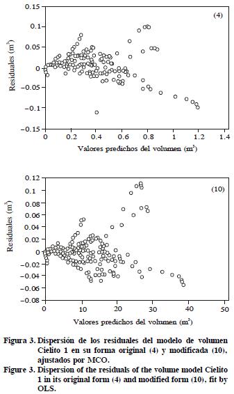 En cuanto a la ecuación compatible de volumen (10), también se observa que existen ganancias en la R2, CME y niveles de significancia de los parámetros, comparados con la ecuación (4) de volumen original (Cuadro 2). Los residuales de ambos modelos presentan tendencias muy similares y problemas de heterocedasticidad (Figura 3).
