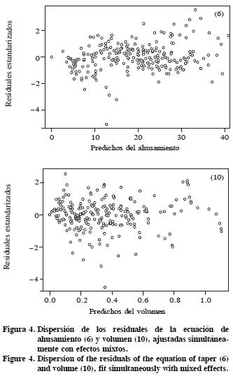 Torres y Magaña ( 2001) mencionan que es común que la mayoría parte de los modelos de volumen sufran problemas de heterocedasticidad dado que a mayores valores de diámetro y altura la variación en los volúmenes de los árboles se hace más grande. Este problema se puede observar en los residuales de las ecuaciones de volumen (4) y (10), ajustadas por MCO (Figura 3), por lo que recomienda corregir esta deficiencia. Sin embargo, al observar los residuales del sistema de ahusamientovolumen propuesto ajustados simultáneamente (Figura 4) se nota que no existe tendencia de heterocedasticidad en ambos modelos, por lo que se confirma que el ajuste con efectos mixtos ayuda a reducir este problema (Fang y Bailey, 2001).