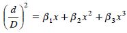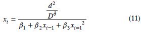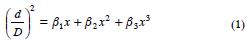donde, d=diámetro sin corteza (cm) a una altura dada (h), así d=0 cuando h=H; D=diámetro normal (cm) a h=1.3 m; x = (Hh)/H; h=altura del fuste al diámetro (d); H=altura total a la punta (m); βi=parámetros del modelo.
