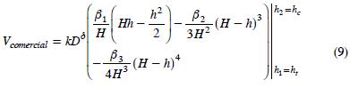 De manera similar, la estructura de Vtroza es modificable a una expresión de volumen comercial acumulado (Vcomercial) definiendo los límites de integración de la siguiente forma: