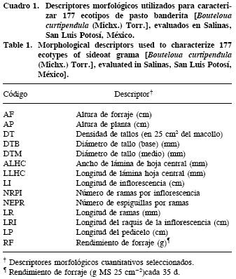 Entre 2000 y 2003 se recolectaron 577 ecotipos de pasto banderita en Aguascalientes, Chihuahua, Coahuila, Durango, Guanajuato, Jalisco, México, Oaxaca, San Luis Potosí, Sonora, Zacatecas, Querétaro y Guerrero. El material se transplantó ex situ en el Colegio de Postgraduados, Campus Salinas de Hidalgo, San Luis Potosí. Después de tres años de evaluación, de 577 ecotipos sobrevivieron 311; como algunos eran repeticiones del mismo sitio, sólo 177 fueron usados para las evaluaciones y para conocer y definir la estructura poblacional. En su fase vegetativa y reproductiva se realizó la caracterización morfológica mediante la calificación de descriptores (Cuadro 1).