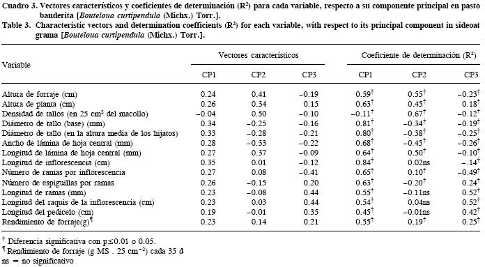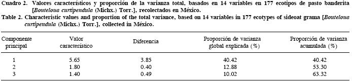 Los tres primeros CP explicaron 63.32% de la variación total entre los diferentes ecotipos de pasto banderita (Cuadro 2). Para el CP1 las variables más importantes fueron longitud de inflorescencia, diámetro de tallo en la base y diámetro de tallo en la altura media de los hijatos; para el CP2, densidad de tallos, altura de forraje y altura de planta; en el CP3, longitud de ramas, longitud del raquis de la inflorescencia y número de ramas (Cuadro 2). Estas variables contribuyeron significativamente con los valores más altos para explicar la variación total. El CP1 se caracterizó por agrupar variables relacionadas con el tallo; el CP2 reflejó que el potencial de forraje está relacionado con la densidad de tallos y altura de forraje; las variables en el CP3 establecen que la longitud y número de ramas se relacionan con el rendimiento de semilla. Estos resultados son similares a los reportados por Ayana y Bekele (1999) al determinar la extensión y patrones de distribución de la variación morfológica de 15 caracteres cuantitativos en 415 accesiones de sorgo; estos autores encontraron que los primeros cinco componentes explicaron 79% de la varianza total. Además, coincidiendo con los resultados del presente trabajo, dichos autores reportan que la longitud de la inflorescencia, el diámetro del tallo en la base y el diámetro del tallo en la altura media de los hijatos fueron agrupados por el CP1; que el CP2 agrupó a la densidad de tallos, la altura del forraje y la longitud de las láminas de las hojas; y que el CP3 incluyó la longitud del raquis de la inflorescencia, la longitud de las ramas y el número de ramas por inflorescencia. La evaluación de estas variables ha permitido una mejor caracterización y selección de la diversidad en otras especies de los géneros Lolium (Bennett, 1997; Bennett et al., 2000), Sorghum (Grenier et al., 2004), Panicum (Das et al., 2004; Casler, 2005) y Bromus (Ferdinandez y Coulman, 2004).