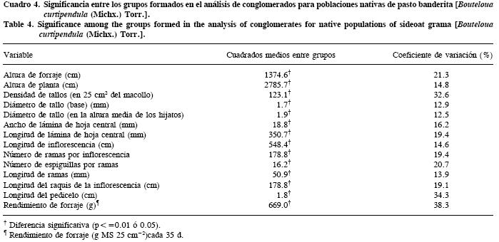 The morphological descriptors involve the management of attributes to carry out breeding of forage species. The objectives of the present study were to explore the morphological diversity of native populations of sideoat grama [Bouteloua curtipendula (Michx.) Torr.] and to evaluate its principal morphological characteristics. To this effect, 177 ecotypes were qualified and analyzed at the moment of flowering by means of 14 quantitative morpological descriptors to know and define the population structure. The data were analyzed using principal components (PCA) and hierarchic analysis of conglomerates (HAC). There was a high morphological variability among ecotypes. The first three components (PC) explained 63.3% of the total variation observed. For PC1, the most important variables were length of inflorescence, stem diameter at the base and at the mean height of the tillers; for PC2, tiller density, forage height and plant height, and in PC3, branch length, length of the inflorescence of the rachis and number of branches. These variables contributed significantly with the highest values to explain the total variation. PC1 grouped variables related to the tiller; with PC2 it was observed that the forage potential is related to tiller density and forage height; with PC3, that the length and number of branches are related to seed yield. When the HAC was applied, five groups were obtained: I with 19 ecotypes, II with 29, IV with 22 and V with 62. Ecotypes with high forage potential were detected according to their morphological variability; therefore, there is genetic wealth in sideoat grama.
