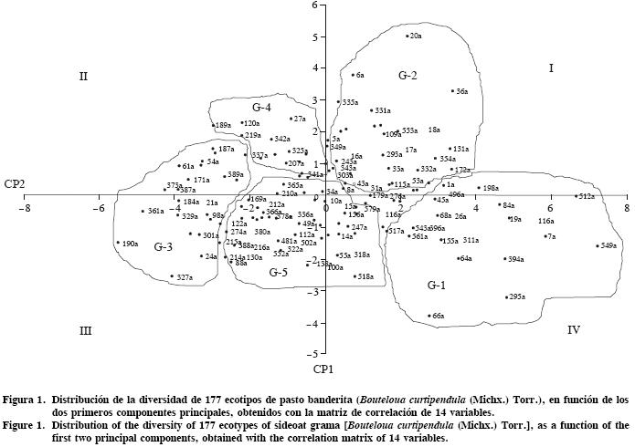 En la Figura 1 se muestra la distribución de 177 ecotipos con base en los componentes principales. El grupo I integró a 19 ecotipos, principalmente de Chihuahua y Durango, ubicados en el cuadrante IV y presentó valores más altos de 10 de las variables morfológicas evaluadas, excepto para altura de forraje, densidad de tallos, longitud de lámina de hoja central y ramas por inflorescencia. El grupo II agrupó a 45 ecotipos recolectados principalmente en Coahuila, Durango y San Luis Potosí y ubicados en el cuadrante I. El grupo III integró 29 ecotipos de Coahuila, San Luis Potosí y Durango, ubicados en los cuadrantes II y III, y presentaron los promedios más bajos en 13 de las 14 variables evaluadas. El grupo IV reunió 22 ecotipos de Coahuila, San Luis Potosí y Zacatecas, ubicados en el cuadrante II; en este grupo los promedios de las variables morfológicas fueron intermedios, ya que sólo la densidad de tallos alcanzó el promedio más alto de todas las variables. El grupo V integró a 62 ecotipos de Coahuila, San Luis Potosí, Durango y Chihuahua que se ubicaron en el centro de la gráfica, principalmente en los cuadrantes III y IV (Figura 1).