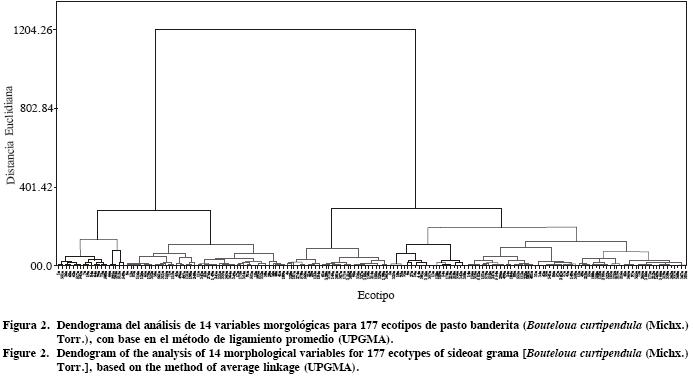 El forraje se cosechó de la planta completa cada 35 d (hasta los 210 d) para evaluar su rendimiento. Las muestras se secaron 48 h en una estufa a 70 °C para medir el rendimiento de MS. Para medir la variación morfológica se usaron las variables AF, AP, DT, DTB, DTM, ALHC, LLHC, LI, NRPI, NEPR, LR, LRI, LP, RF (códigos en el Cuadro 1) que se analizaron usando componentes principales (ACP). Para analizar los datos se usó el procedimiento PRINCOMP (SAS, 1999). Se analizó la matriz básica de datos de 177 ecotipos y la matriz de correlación del ACP se usó para determinar atributos relevantes en los ecotipos, calculándose el coeficiente de determinación (R2) de las variables en cada componente principal. Además, se realizó un análisis de conglomerados jerárquico (ACJ) mediante el método de ligamiento promedio (UPGMA); a partir de la matriz de correlación se realizó el dendograma y un análisis de varianza.