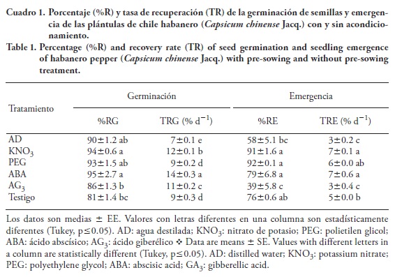 Habanero pepper (Capsicum chinense Jacq.) seeds decrease their germination after storage periods exceeding 100 d. Pre-sowing treatments, reinvigorate, accelerate and uniform seed germination of the genus Capsicum. In this study habanero pepper seeds were pre-treated during 144 h with constant aeration in distilled water and aqueous solutions (treatments) of: KNO3 at 3 %, polyethylene glycol (PEG) at 0.5 MPa, abscisic acid (ABA) at 10-5 M and gibberellic acid (GA3) at 400 ppm. After pre-sowing treatments, seeds were germinated in petri dishes and trays (the control was sown without pre-treatment). The experimental design was a completely randomized, the data were used to perform ANOVA and means were compared using Tukey test (p≤0.05). Results showed that seeds treated with ABA (13.22 % of germinated seeds d-1) increased germination rate compared with the control (6.38 % of germinated seeds d-1) and all pre-sowing treatments increased the germination percentage (%G), but not all of them maintained that increase during emergence. In emergence percentage (%E) only PEG and KNO3 treatments (osmotic) were statistically different from the control surpassing it at 36 and 21 %. Osmotic treatments avoided protrusion during the pre-sowing treatment and their %E was similar to %G. The pre-sowing treatment of seeds is optimal if germination and emergence is increased; therefore the pre-sowing treatment of habanero pepper seeds with KNO3, PEG and ABA is more appropriate to increase seedling establishment.