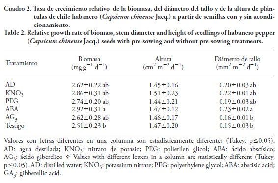 El %RE mayor de la emergencia (92 y 91) correspondió a las semillas acondicionadas con las soluciones osmóticas PEG y KNO3, y las tratadas con AG3 tuvieron el valor menor. La TRE mayor fue para las semillas acondicionadas en KNO3 y ABA (7 % d-1 en ambos casos) y contrastó con la más lenta, la de las semillas en AD y AG3 (3 % d-1 en ambos casos) (Cuadro 1). Las semillas de los dos tratamientos osmóticos no germinaron durante el acondicionamiento, pero su %RE fue más alto, y a pesar de no ser las más veloces en la germinación, sí lo fueron en la emergencia. Los beneficios del acondicionamiento osmótico en este estudio coincidieron con los reportados por otros autores. Demir y Oztokat (2003) observaron aumento de 11 % de la germinación de semillas de melón con KNO3, y Sundstrom y Edwards (1989) aumentaron 45 % la germinación de C. frutescens. Yaklich y Orzolek (1977) aumentaron 10 % la emergencia de C. annuum con PEG, y Sánchez et al. (1997) 19 % la germinación en pepino.