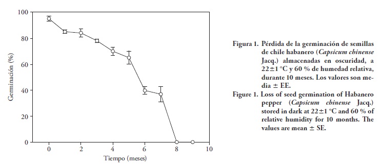 Las semillas de chile habanero provenientes de una bolsa (1 Lb) sellada y envasada con alto vacío (semillas Seminis, Zapopan, México) fueron almacenadas 10 meses a 22 °C, en la oscuridad y con 60 % de HR. La germinación de las semillas almacenadas (25 de ellas, con cuatro repeticiones) se evaluó cada 30 d en toallas de papel humectadas con agua destilada, en bolsas plásticas, en la oscuridad a 22 °C, y durante 20 d se contabilizó la germinación. La semilla se consideró germinada cuando se observó la protrusión radicular. La viabilidad de las semillas se evaluó con la prueba topográfica de cloruro 2, 3, 5 trifenil tetrazolio (Sigma-Aldrich) (Moreno, 1996).