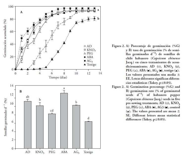 El %G promedio de las semillas acondicionadas fue estadísticamente superior al del testigo (81) (Figura 2A). La TG (como % de semillas germinadas d-1), de las semillas acondicionadas con ABA (13.22), AD (11.23), AG3 (10.29), KNO3 (10.20) y PEG (8.20) fue mayor que la del testigo (6.38) (Figura 2B).