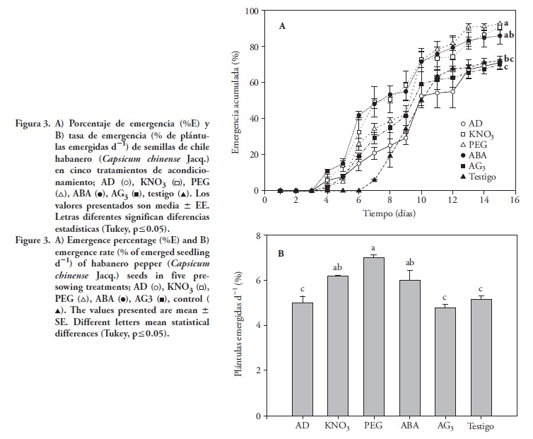 La TE de las plántulas después del acondicionamiento de las semillas con PEG y KNO3 fue mayor (36 y 21 %) que la del testigo el cual no fue diferente a la TE de las tratadas con AD y AG3 (Figura 3B). Así, es probable que la germinación durante el acondicionamiento en los tratamientos no osmóticos haya ocasionado algún daño mecánico en los tejidos radiculares e inhibido su desarrollo en el sustrato, lo cual fue evaluado como caída de la velocidad en la emergencia o inhibición completa.