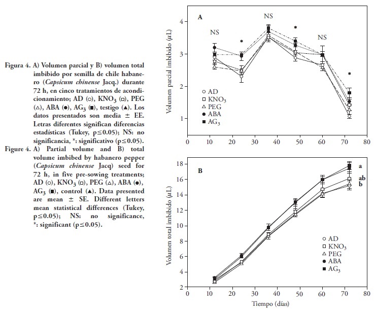 Para medir la imbibición de las semillas, se pesaron 15 semillas sin acondicionar (tiempo 0; T0), se colocaron en una caja petri, se agregaron 8 mL de la solución acondicionadora respectiva (AD, KNO3, PEG, ABA o AG3), y las semillas se pesaron individualmente a las 12 (T1), 24 (T2), 36 (T3), 48 (T4), 60 (T5) y 72 (T6) h. Con la diferencia del peso entre los muestreos se calculó la imbibición con las unidades de peso transformadas a unidades de volumen (1 mg de peso aumentado = 1 μL imbibido). El volumen parcial se obtuvo con la diferencia de los tiempos (e.g., volumen parcial imbibido a las 12 h= T1-T0, a las 24= T2-T1), mientras que el volumen total imbibido se obtuvo sumando el valor de todos los tiempos (e.g., volumen total imbibido= T1+T2+T3+T4+T5+T6). Hubo tres repeticiones por tratamiento.