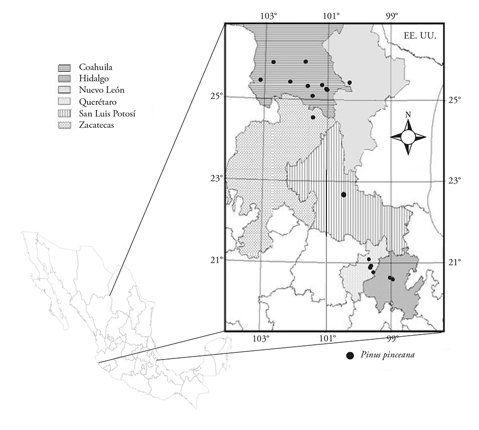 Pinus pinceana Gordon es un pino piñonero endémico de México, su distribución está restringida a 17 poblaciones pequeñas y aisladas, en montañas semiáridas de la sierra Madre Oriental, en suelos de origen calcáreos, entre 1400 y 2300 msnm, en los estados de Coahuila, Zacatecas, San Luis Potosí, Nuevo León, Querétaro e Hidalgo (Ledig et al., 2001; Favela et al., 2009; Villarreal-Quintanilla et al., 2009). El sobrepastoreo con caprinos y la recolección de leña y conos han colocado a la especie en riesgo de extinción (Richardson y Rundel, 1998; Ledig et al., 20011). Este árbol piñonero está sujeto a protección especial por el gobierno mexicano, por lo que se requieren estrategias de conservación y manejo (Ledig et al., 2001; Molina-Freaner et al., 2001).