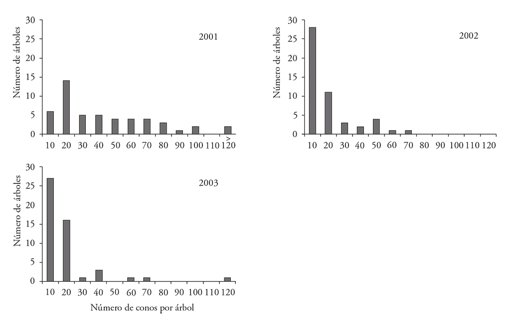 No hubo diferencias significativas entre las dos localidades, pero si entre años y la interacción de las poblaciones x años (Cuadro 2). La producción de conos en los 50 árboles (25 de cada población) fue variable durante los tres años de estudio (Figura 2). La producción de conos fue significativamente mayor en 2001, con 2,188 comparado con 747 y 695 conos en 2002 y 2003 al contabilizar los 50 árboles recolectados.