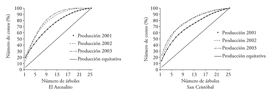 Al generar una curva acumulada de producción de conos se encontró que pocos árboles producen la mayor proporción de semilla y entre más pronunciado sea el arco, menos árboles producen la mayor cantidad de conos. Lo ideal es que cada árbol produjera la misma cantidad de conos y semillas (línea de producción equitativa, a 45°). Diez árboles o menos produjeron 50% de los conos en cada uno de los tres años (Figura 3). Dado que pocos individuos producen la mayor cantidad de germoplasma en un ciclo de producción, se esperaría una menor variabilidad genética en la progenie respecto a la posible, lo cual debe ser más drástico durante el segundo y tercer año, cuando menos árboles producen 50% del total de conos. Además hubo una correlación significativa entre la producción de conos por árbol entre 2002 y 2003 (r=0.53, p=0.003), pero no con la de 2001. Lo anterior indica que no todos los individuos producen la misma cantidad de conos en cada año y que un pequeño porcentaje de árboles contribuye más al establecimiento de plántulas en un año determinado, pero diferentes árboles pueden aportar semilla en tiempo (por eso la baja repetitividad entre años).