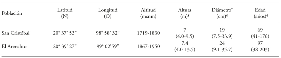 Las dos poblaciones de estudio están ubicadas en el municipio El Cardonal, Hidalgo, separadas por 8 km (Cuadro 1). La población de San Cristóbal se encuentra dentro de la Barranca de Tolantongo, con vegetación arbórea de bosque bajo de Juniperus flaccida Schltdl. (Hiriart y González, 1983). La población El Arenalito está en la cañada del mismo nombre, con vegetación en el estrato arbóreo dominado por Pinus cembroides Zucc. y Yucca filifera Chabaud (Villarreal-Quintanilla et al., 2009).