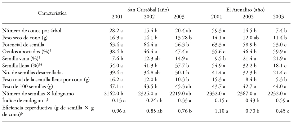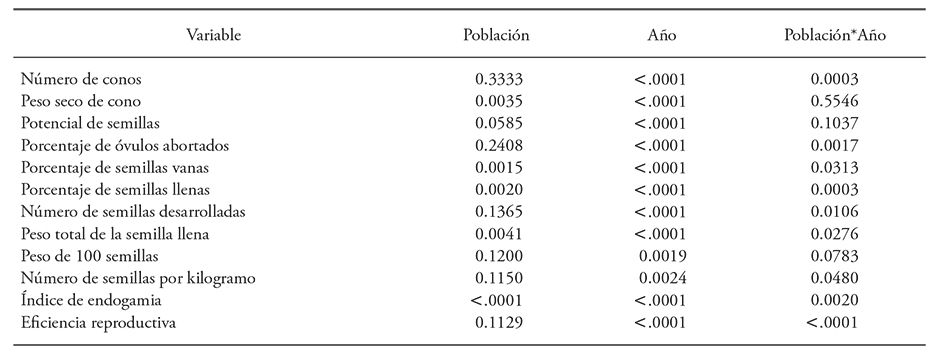 Aunque hubo diferencias significativas en algunas características, muy poca variación se atribuyó a diferencias entre las dos poblaciones naturales (Cuadro 3). No hubo diferencias significativas entre poblaciones para el número de conos, potencial de semilla, óvulos abortados, número de semillas por kilogramo y en eficiencia reproductiva. La interacción poblaciones x año de recolecta fue significativa en todas las características. Así, la producción de las semillas llenas fue notablemente superior en 2001 y fue escasa en 2002 y 2003, aunque entre estos dos años fue variable según la población. El peso de la semilla fue mayor en 2001 en San Cristóbal, sin diferencias entre años en El Arenalito.
