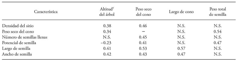 Cuadro 4 Coeficientes de correlación de Pearson significativos (p≤0.05) entre características de producción de conos y semillas de Pinus pinceana Gordon (n=50)