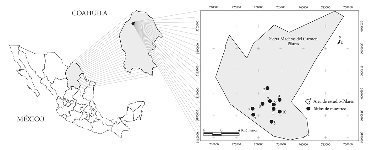 El área de estudio se ubicó en los planos desérticos de la Sierra Maderas del Carmen al norte de Coahuila, dentro del área de conservación privada Los Pilares (McKinney et al., 2006) (Figura 1), entre 29° 22.45’ y 28° 42.21’ N, 102° 56.23’ y 102° 21.08’ O, a una altitud de 1182 m. El promedio anual de precipitación es 237.4 mm y de temperatura es 21.5 °C. Los suelos predominantes son castañozems cálcicos, rendzinas, vertisoles crómicos, litosoles y regosoles calcáricos (SPP 1982a; 1982b; 1983). Los tipos de vegetación incluyen bosques de encino (Quercus), pino (Pinus) y oyamel (Abies); matorral submontano, zacatal y matorral desértico chihuahuense; que incluye los matorrales micrófilo, rosetófilo, comunidades gipsófilas y halófilas (INE-SEMARNAT, 1997). Las parcelas experimentales se ubicaron en el matorral desértico micrófilo y rosetófilo.