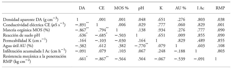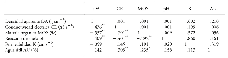 El coeficiente de Spearman mostró correlación negativa significativa entre la densidad aparente, la CE (-0.476) y la MOS (-0.537), y una correlación positiva significativa entre la densidad aparente y el pH (0.409). La correlación de CE fue significativa positiva con el MOS (0.701) y con el agua útil (0.305), pero con el pH (-0.401) fue negativa. La MOS presentó una correlación significativa negativa con el pH (-0.292) y una positiva con el agua útil (0.235) (Cuadro 1).