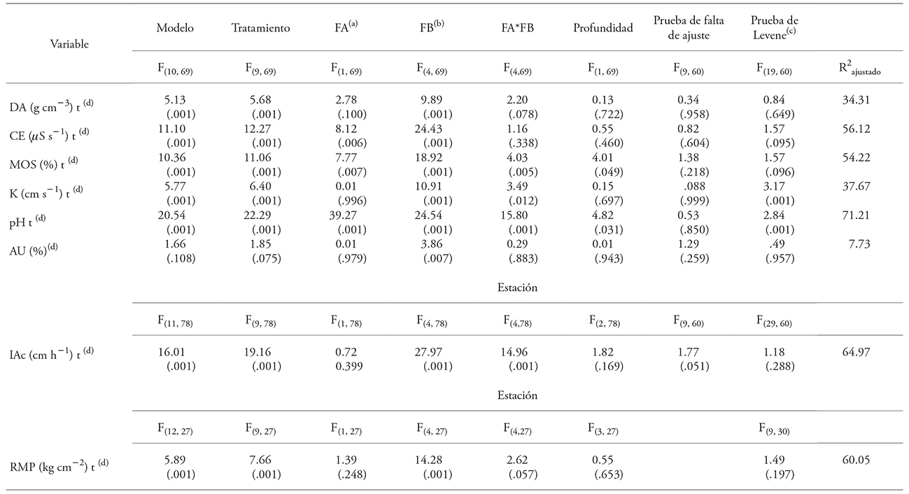 Los análisis estadísticos se realizaron en el programa SPSS®, versión estándar 22 para Windows (SPSS Inc., Chicago, IL.). Para probar los supuestos de normalidad y homogeneidad de varianzas para las variables analizadas los datos se sometieron a la prueba de Kolmogorov-Smirnov con la corrección de Lilliefors (Gómez et al., 2003). Las variables se transformaron para inducir a la distribución normal: los valores de CE se transformaron a cuadrado del inverso, el porcentaje de MOS se transformó a arcoseno raíz cuadrada de la proporción, los valores de K se transformaron a raíz cuadrada del inverso, los de pH se elevaron a la décima potencia, mientras que los de infiltración acumulada (IAc) y RMP fueron transformados a logaritmo (McCune y Grace, 2002).