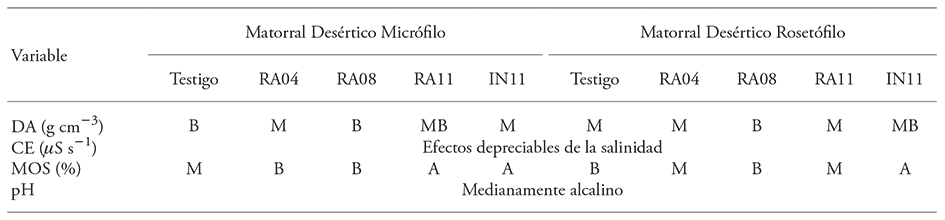 Rusan et al. (2007) evaluaron los efectos sobre las variables de calidad de suelo y planta a largo plazo en la irrigación de cultivos con aguas residuales y las concentraciones de pH, Cu, Zn, Fe y Mn no presentaron cambios. Nuestro estudio es similar a lo anterior porque el pH no cambió lo suficiente para involucrar dos categorías diferentes en la norma utilizada en laboratorio. Los resultados muestran que el uso del tratamiento mecánico de rodillo aireador es una alternativa viable para incrementar la permeabilidad y la materia orgánica del suelo solo a corto plazo, ya que la primera mostró aumento significativo en el valor de la variable en el matorral desértico rosetófilo. Sin embargo, después de 8 a 10 años (tratamientos de 2004 y 2008), MOS e IAc disminuyen, al tiempo que aumentan DA y pH.