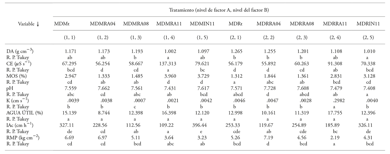 El valor K del suelo mostró tres grupos definidos: en el grupo a, el tratamiento MDRRA11 (0.298 cm s-1); en el grupo b, los tratamientos MDMt (0.004 cm s-1), MDMRA04 (0.004 cm s-1), MDMRA11 (0.002 cm s-1), MDMIN11 (0.004 cm s-1), MDRt (0.005 cm s-1), MDRRA04 (0.004 cm s-1), MDRRA08 (0.003 cm s-1), y MDRIN11 (0.004 cm s-1); en el grupo c, el tratamiento MDMRA08 (0.007 cm s-1).