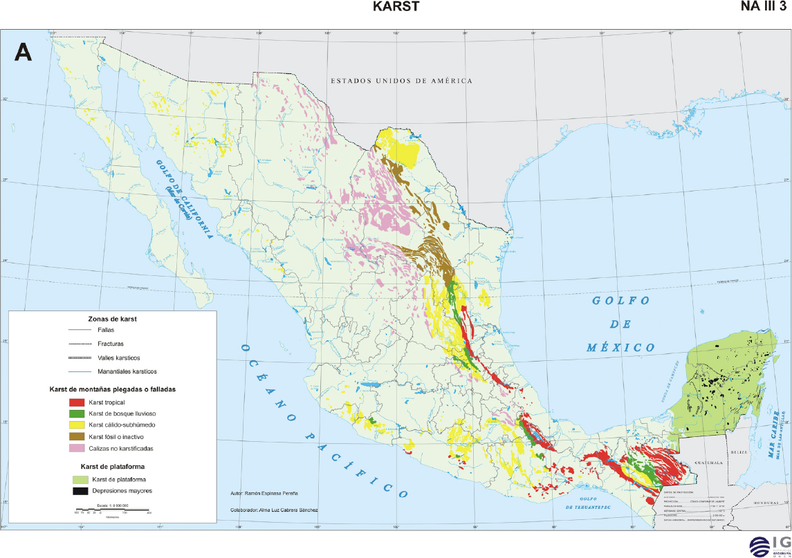 Figura 1 Mapa de zonas kársticas en México, Espinasa-Ramón, 2007. Atlas Nacional de México, http://www.igeograf.unam.mx/sigg/publicaciones/atlas/anm-2007/muestra_mapa.php?cual_mapa=NA_III_3.jpg.do (2001).