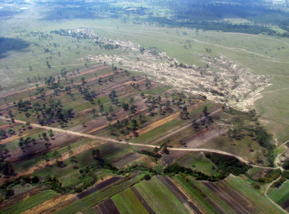 Figura 10 Vista aérea de la unidad de Restos de piedemonte con depósitos antiguos disectados, donde se observan las cárcavas que ocupan amplias áreas de la unidad IX, como expresión de procesos erosivos avanzados favorecidos por el cambio de uso de suelo.