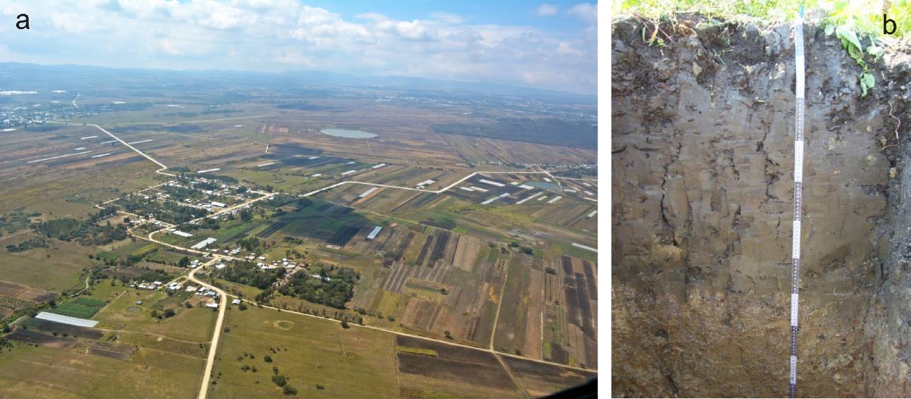 Figura 11 (a) Ejemplo de la Planicie acumulativa de origen lacustre residual Unidad XI, vista al SE en donde se observa el desarrollan suelos oscuros (b) Perfil de suelo descrito en la localidad del Triunfo, la escala métrica muestra una discontinuidad textural del perfil a 70 cm de profundidad, se identifican un aumento en proporción de sedimentos enriquecidos en limo (Martínez, 2015).