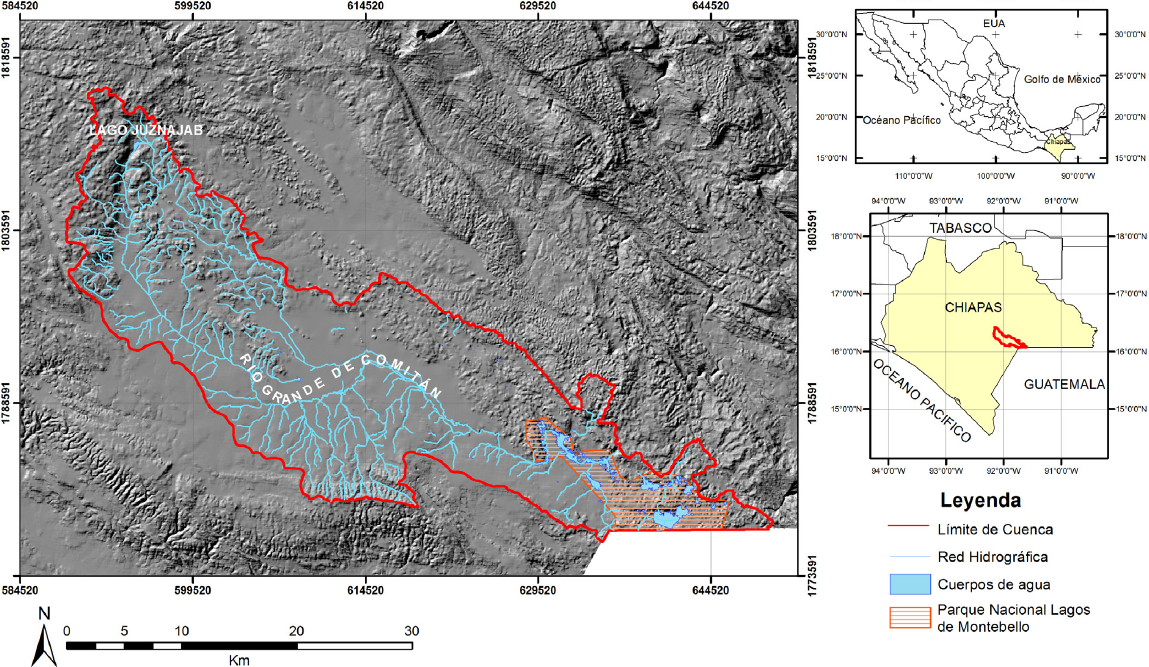 El área de estudio comprende la cuenca del Río Grande de Comitán-Lagos de Montebello. La cuenca (Figura 2), tiene una extensión de 810.43 km2, está comprendida dentro la cuenca del Río Lacantún (INEGI, 2007). Desde el punto de vista hidrológico esta cuenca es parte de la Región Hidrológica No. 30 Grijalva-Usumacinta en la región Sur-Sureste en el estado de Chiapas conocida como la provincia de la Meseta Central (Altiplanicie o Altos de Chiapas) (CFE, 2012).