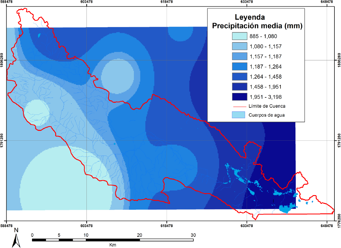 Por otro lado, la precipitación media anual es de 1482.6 mm, y se observa en la Figura 3 que no hay una distribución uniforme de la precipitación, puesto que los valores varían de un mínimo de 895.1 mm hasta un valor máximo de 2587.9 mm. Los meses más lluviosos son de junio a septiembre, este último es el mes con los máximos valores de precipitación, por lo cual la mayor precipitación ocurre en verano.
