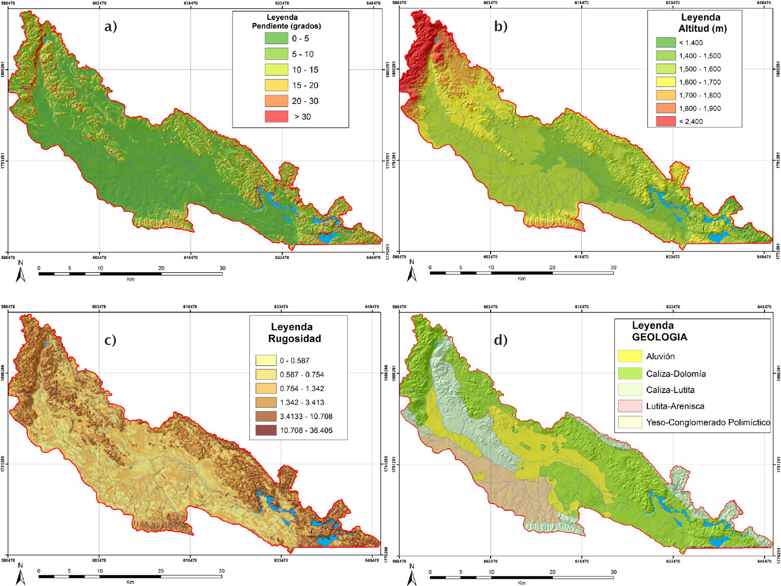 IX. Restos de Piedemonte con Depósitos Antiguos Disectados: Esta unidad se localiza en la parte sur-centro de la cuenca y ocupa un área de 34.12 km2. Corresponde litológicamente a materiales deformados por calizas y dolomías, con pendientes muy suaves (máximo 19.2°) y rugosidad baja de 6 (Tabla 1).