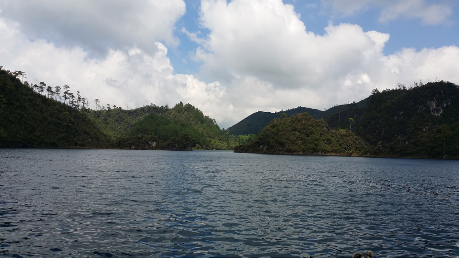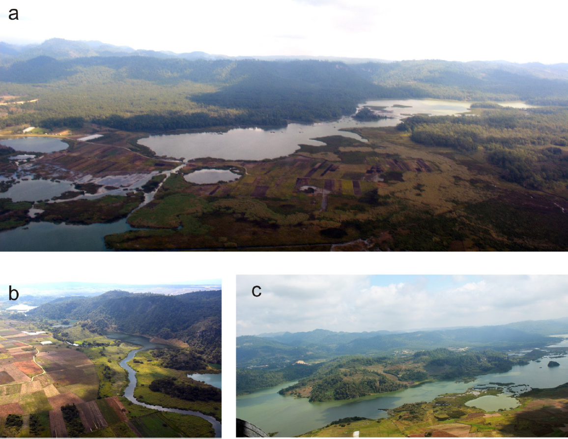 Figura 6 Ejemplo de la unidad I, una vista al NE de los lagos de Montebello que representan las elevaciones bajas con karst de dolinas y poljes inundados.