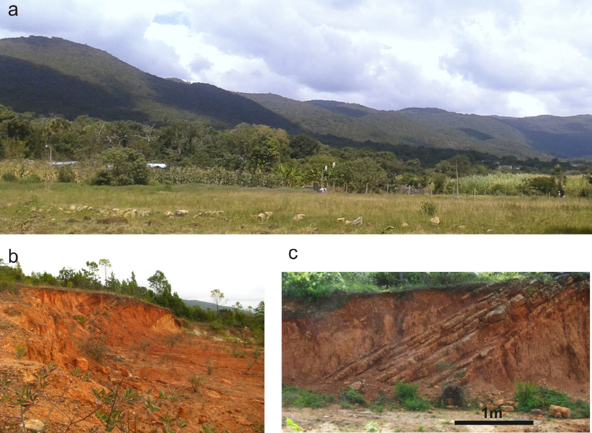 Figura 8 (a) Fotografía panorámica hacia el NO de la unidad V de terrazas estructurales, en donde se observan las pendientes pronunciadas (b) Se aprecia el material calcáreo y poco desarrollo de suelo (c) En este corte sobre la carretera se aprecia los pliegues en dirección N-S.