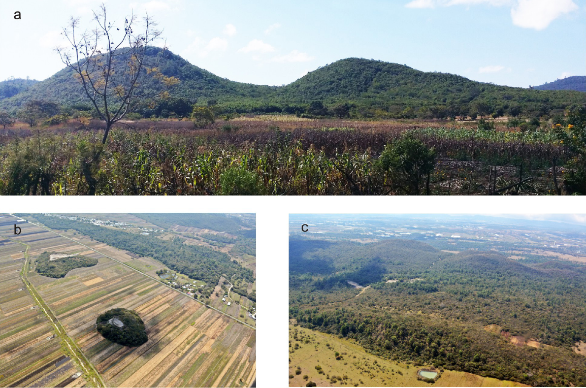 Figura 9 (a) Fotografía panorámica de la zona de Mogotes relícticos, vista al E donde se observa al fondo la morfología redondeada de los mogotes inmersos en la Planicie kárstica antigua cubierta con material residual (b) Ejemplo de Mogotes aislados dentro del material residual de la unidad X (c) Otro ejemplo de Mogotes cubiertos de vegetación natural vista al SE.