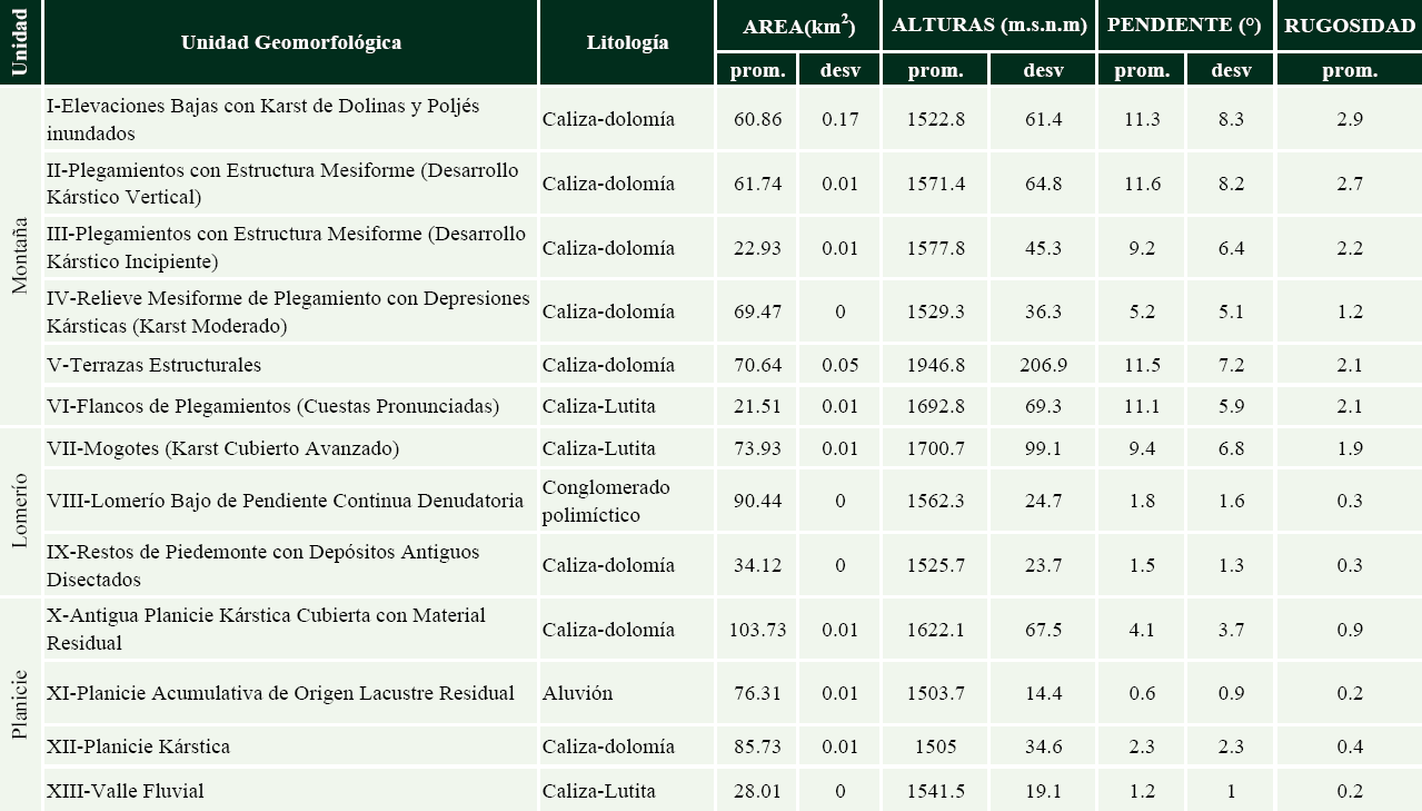 Desde el punto de vista de las características analizadas, se reconoce un conjunto de morfologías con carácter principalmente kárstico, en el que coincide la presencia de rocas calizas y dolomías como principal factor litológico. En proporción relativa, la precipitación actual parece definir la morfología de las unidades de montaña, ya que la diferenciación entre las terrazas estructurales y el relieve mesiforme está marcada por el volumen de agua que recibe cada zona y la intensidad de disolución, en este sentido, las expresiones morfológicas son diferentes.