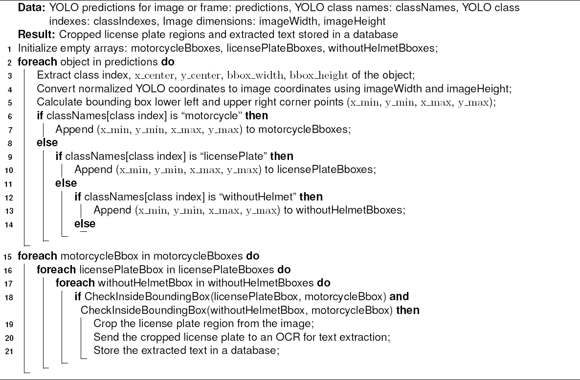 With reference to the algorithm 1 and figure 4, our model first stores the information of the bounding boxes of the number plates, motorcycles, and WithoutHelmet classes. Then, for every motorcycle’s bounding box, we are only considering the top 40% section of the box, as this serves as the most likely region where we are going to find a rider’s head.