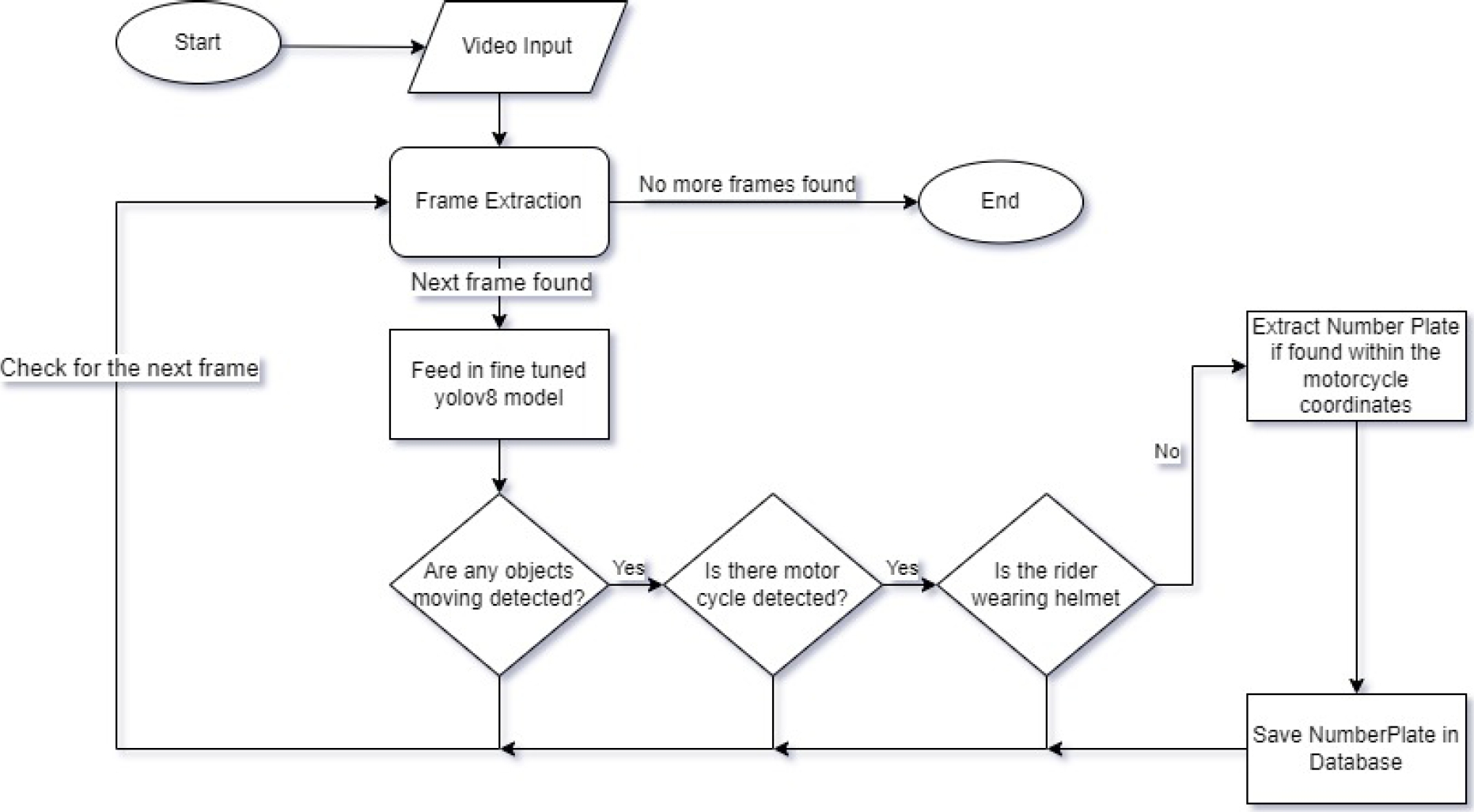 Our approach will be using state of the art YOLOv8fn model to extract the number plates of the without-helmet bike riders and store them in a database. This information can then be used to enforce helmet usage regulations and educate riders about the importance of helmet safety.