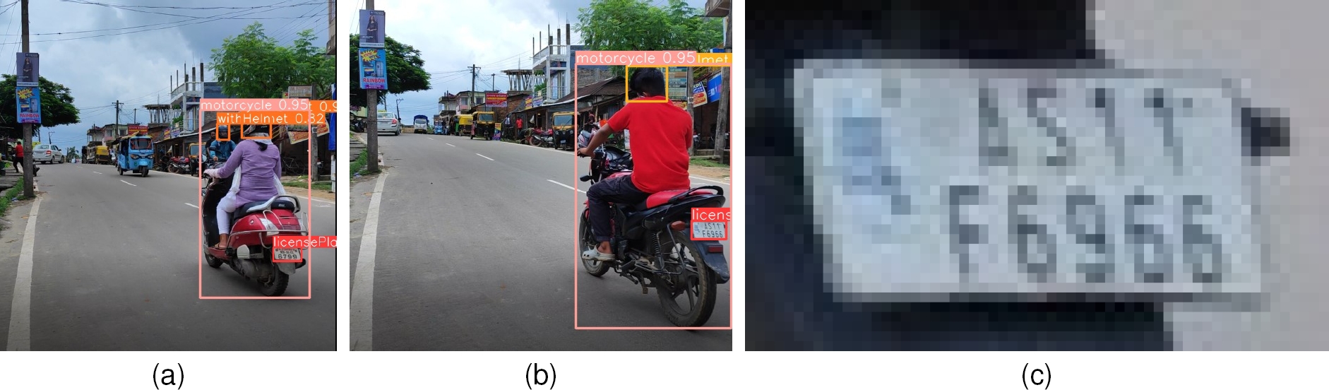 Fig. 6 Inferences from the model. (a) A biker with Helmet. (b) A Biker without Helmet. (c) Extracted Numberplate. Here (c) is the numberplate extracted from (b), i.e. without helmet biker