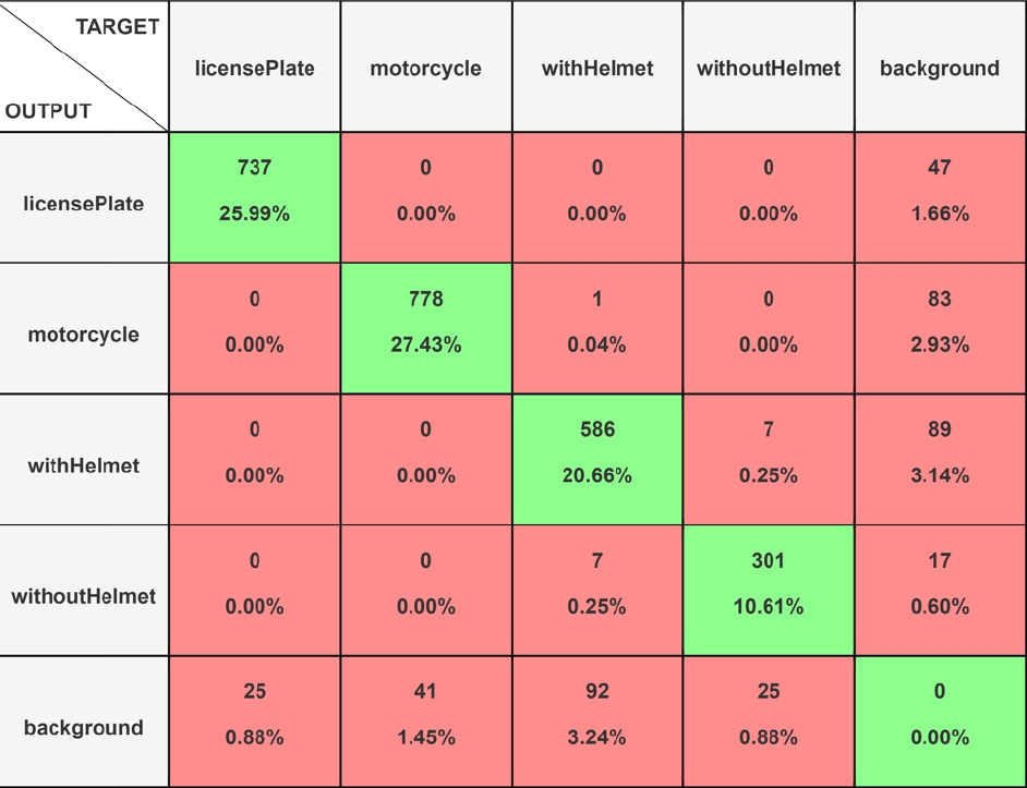 Though licensePlate and motorcycle classes achieved outstanding results, the withHelmet and withoutHelmet classes showed lower precision and recall values, indicating potential room for optimization. The model speed, with preprocessing, takes 0.8 milliseconds, inference takes 29.2 milliseconds and postprocessing consumes 3.5 milliseconds per image, showing its efficiency in real-time applications.